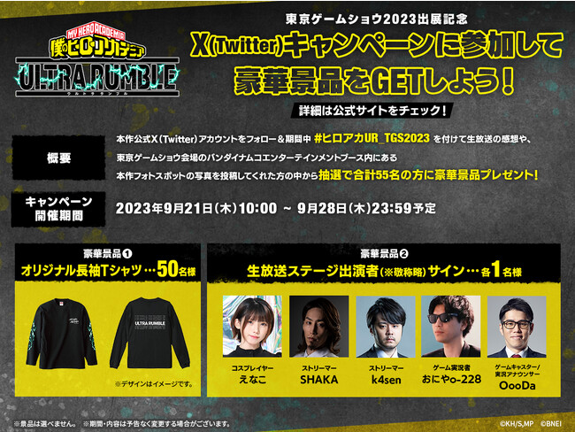 ◆概要:「僕のヒーローアカデミア ULTRA RUMBLE」公式X(Twitter)アカウントをフォロー&期間中「#ヒロアカUR_TGS2023」を付けて生放送の感想や、東京ゲームショウ会場のバンダイナムコエンターテインメントブース内にある本作フォトスポットで撮影した写真を投稿してくれた方の中から抽選で合計55名の方に豪華景品をプレゼント!生放送の感想はリアルタイムではなく期間中アーカイブを見た感想でもOK!