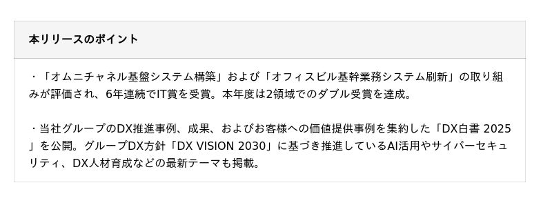 2025年度「IT賞」においては、当社グループの商業施設(リアル)とEC(デジタル)の強みを掛け合わせて、お客様の利便性向上や新たな購買体験の創出、価値向上を目指す「オムニチャネル基盤システム構築」が「IT賞(顧客価値・サービス革新)」を、オフィスビルの運営管理における業務効率化、保守継続性担保、データ活用高度化を進める「オフィスビル基幹業務システム刷新」が「IT奨励賞(経営・業務改革)」をそれぞれ受賞しました。2020年度の初受賞以来、当社は6年連続のIT賞受賞となります。