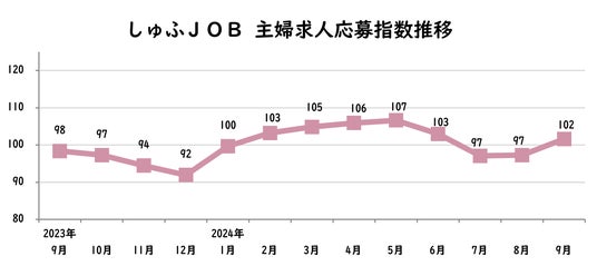 子育て層の就職活動が鈍化する夏休みが終わったことで、9月の応募数が増加するのは例年通りの傾向だが、9月の応募指数が100を上回るのは2020年以来。さらに、職種別に見ても、全職種で応募数が前月比を上回ったことからも、例年以上にしゅふ層の就職意欲が高まっていると考えられる。
