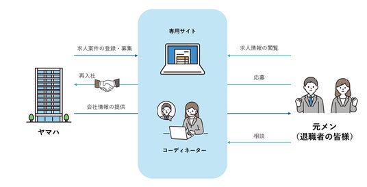 このたび開設した「元メン専用サイト」は、ヤマハ株式会社で1年以上勤務した経験があれば誰でも登録が可能です。会社情報や求人情報に加え、各種インタビュー記事やイベント開催情報などの掲載を予定しており、当社に関する最新情報にアクセスいただくことで、当社との継続的なつながりを持っていただけます。また、本サイトでは専用コーディネーターによるサポートを受けられるため、再入社を希望する退職者が応募しやすい仕組みとなっております。