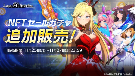 株式会社enish(本社:東京都港区、代表取締役社長:安徳孝平、以下enish)は、2024年11月25日(月)、「GEEKOUT PTE. LTD.(本社:シンガポール、代表取締役:嶋瀬 宏)」と連携し、開発中のモバイルゲームクオリティのブロックチェーンゲーム『De:Lithe Last Memories(ディライズ ラストメモリーズ)』のNFTドールガチャセール(2024年11月12日(火)および11月19日(火)に実施)で販売した1体1万円のNFTドール2,000体が完売したことをお知らせします。また、購入希望者が多数いらっしゃることから、追加販売を期間限定で開始しました。購入方法はGEEK及びクレジットカード決済によるものとなります。詳細は下記をご確認ください。