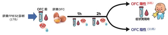 以前に卵黄FPIESと診断された患者17名を対象とし、5gの加熱卵黄を用いた経口食物負荷試験(OFC) (注4)を実施しました。OFC実施前と摂取後1時間および2時間で、血清および唾液サンプルを採取しました。また、OFC陽性群では、症状発現時の血清も採取しました。これらのサンプルを用いて、高深度プロテオーム解析を行いました。