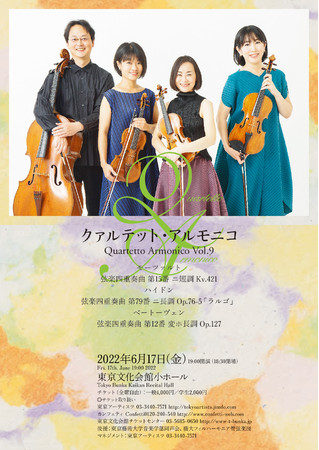 『クァルテット・アルモニコvol.9』が2022年6月17日(金)に東京文化会館 小ホール(東京都台東区)にて開催されます。チケットはカンフェティ(運営:ロングランプランニング株式会社、東京都新宿区、代表取締役:榑松 大剛)にて発売中です。