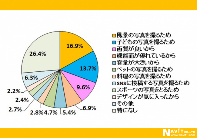 「風景の写真を撮るため」16.9%と「子どもの写真を撮るため」13.7%を合わせると回答数の約3割に当たります。その次に「画質がいいから」9.6%、「機能面が優れているから」6.9%となっています。