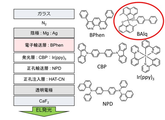 図2 OLED1の素子構成と用いた有機分子の化学構造