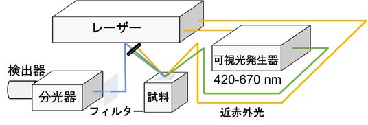 本研究では、このSFG分光装置を改良し、新たに界面の電子スペクトルを取得するための「電子和周波発生分光(ESFG分光(図1))」を可能にした技術を開発しました。この手法は、波長を自在に変えることのできる可視光と近赤外光を試料に照射することで、物質界面での紫外可視吸収スペクトルを選択的に取得することができる手法です。さらに試料に電界が生じている際には、その電界の大きさや向きに応じて信号強度が変化する「電界誘起効果」を利用することで、複雑な構造を持つ有機ELをはじめとする有機デバイスを駆動した際の内部の電荷移動状態をリアルタイムで計測・解析することが可能です。