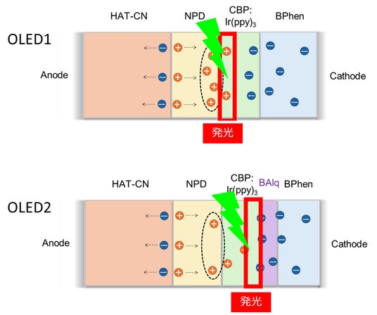 さらに、ESFG分光により、OLED1では、注入された電荷が発光層と正孔輸送層であるNPD層との界面で再結合して発光が起こっている(図3上)のに対して、BAlqを挿入した素子では、正孔が発光層/BAlq界面にまで到達し、EL発光している界面が移動していることがわかりました(図3下)。OLED1ではロールオフ(注3)による発光効率の低下が見られるのに対して、BAlqを挿入したOLED2とOLED3ではこの現象が見られず、特にOLED2では高輝度領域における電流効率はOLED1より高くなっています。素子のロールオフを低減させるには発光する位置を変えることが有効な手段の一つですが、BAlqを挿入することで、素子を構成している各々の有機層が分担する電位のバランスが変化し、発光層の中でのEL発光する位置が変わります。これによって極端に偏った電荷の局在が解消し、ロールオフが低減し、結果的に高い輝度を示す領域での電流効率が向上したという、素子の発光効率の向上の仕組みが新たにわかりました。また、BAlqを用いることで、界面での過度の電荷集中が解消することにより、素子の寿命が長くなるという、素子の長寿命化の仕組みも合理的に説明できます。
