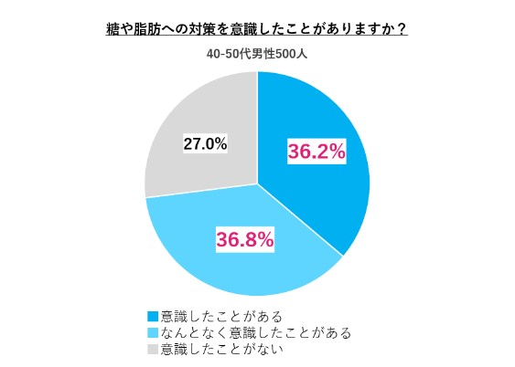 40-50代男性500人に対して、『あなたは糖や脂肪への対策について意識したことがありますか』という質問に対して、「意識したことがある」と答えた人が36.2%、「なんとなく意識したことがある」と答えた人が36.8%と、計73.0%が糖や脂肪への対策を意識したことがあることが分かりました。