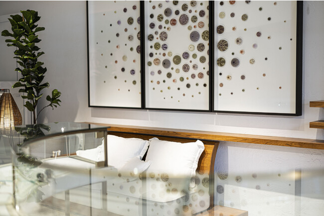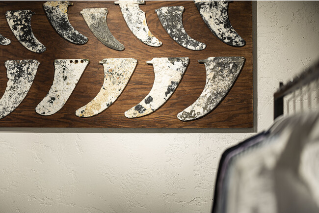 そして店内に心地よい彩りを添えるのは“海”をキーワードにした素晴らしいグリーンアートたち。アメリカの木工作家であるGeorge Peterson(ジョージ・ピーターソン)が手掛けたスケートボードの廃材を繋ぎアンモナイトを描いた作品や使われなくなった一枚板から削り出されたウッドボード作品、ハワイのライフガードでレジェンドボディサーファーでもあるMark Cunningham(マーク・カニングハム)がオアフ島内のサーフスポットから拾い集めたサーフボードのフィンを使った作品、自然主義者でデザイナーやフォトグラファーとしての顔も持つアーティストChristopher Marley(クリストファー・マーレ―)による自然のままの色合いが美しいウニの殻を使った作品、カリフォルニアを代表するサーファーでアーティストのTyler Warren(タイラー・ウォーレン)がワイキキ店のロケーションにあわせて書き下ろした作品など、ワイキキ店のためだけにつくられた特別なコミッションワークの作品たちがお迎えします。