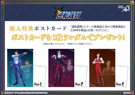 「逆転裁判」シリーズ新商品を含めて関連商品を2,200円(税込)お買い上げごとに、購入特典としてポストカード(全3種)をランダムで1枚プレゼント。