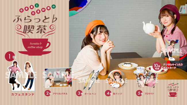 1等は、思わず自分のデスクに飾りたくなる佐倉さん・田嶌さんの全身カフェスタンド。2等は眺めて楽しい素敵なアクリルパネル3種。3等は二人がデザインしたオリジナルボールペンで、番組ではすっかりおなじみとなったうさぎとパンダのイラスト入り! そして4等は缶バッジ4種に、5等はブロマイド10種という豪華ラインナップ。