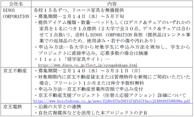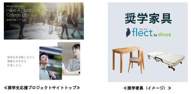 プロジェクト開始となる今年度は、中央大学、明治大学に通う公的奨学金を受給する学生を対象に、DINOS CORPORATIONで展開する新品家具レンタルサービス「flect」で返却された家具を『奨学家具』として無償提供を行うほか、京王不動産では、自社貸主物件または管理物件の賃貸住宅契約時においてフリーレント1か月または仲介手数料を無料とする取組みを実施します。また、京王電鉄では、本プロジェクトの円滑な推進のため、賛同いただける大学との連携、自社広報媒体等を用いた認知度向上に取り組みます。