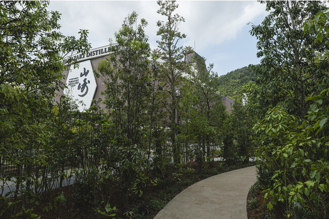100周年を迎える新たな山崎蒸溜所の装いとして、エントランス部分をはじめとした敷地内に自然との調和を表現した“杜”を形成するため、周辺エリアの島本町や大山崎町の山林地に生育する草木などを植栽し緑地化しました。蒸溜釜の銅素材を再利用した門をくぐり抜け、山崎の“杜”ならではのどこか神秘性も感じられる空気感を味わいながら、見学ツアーや場内見学の新たな受付となる山崎ウイスキー館へのアプローチをお楽しみいただけます。
