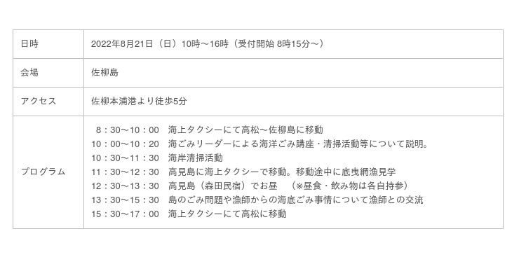 瀬戸内海の海洋ごみ問題を知らない大学生を対象として、香川県の離島・佐柳島を舞台に海岸清掃を体験したり島民や漁師の海底ごみの実情についてお話を聞いたりすることができます。そして海洋ごみ問題を自分事としてとらえたうえで、学内でのプラごみ削減に向けた施策を検討するために実施致します。香川大学生との活動を踏まえ、秋に開催される香川大学の学園祭にてより多くの学生とプラごみ削減などについて考える場を設ける予定です。