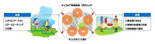 今回のイベントでは、レンタサイクルで会場近隣の市町村をぐるぐると散策(ポタリング※)しながら、チームメンバーと協力してマップに記載したチェックポイントで写真撮影することで得られるポイントを競う参加型イベントになります。あわせて、夜には浜通り地域の食材を使ったBBQを開催し、参加者同士や地域の生産者との交流を図っていただく予定です。