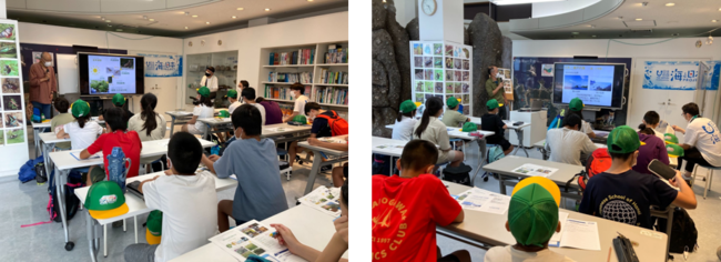 まず最初に、日本海の現状・課題・解決策について学びました。さらに、豊岡市竹野の海について、豊富な資源を活用する文化が育まれ、今もなお比較的豊かな生態系が保たれているが、近年ウニの大量発生による食害から磯焼け(藻場の減少)などが起き、サザエをはじめとした水産資源の収穫量減少が起きている現状について、以降の体験学習に繋げるための知識を得ました。
