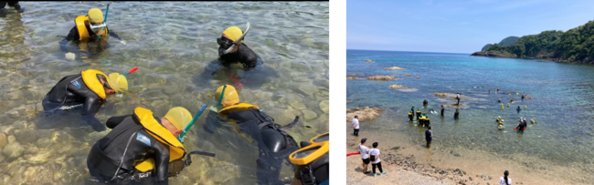 実際に海に入り自分の目で見て手で触って、“生物多様性”について理解を深めました。クロダイやアジなど日本海の豊かな生態系を実際に自分の見て感じることができました。また、今回の学びのテーマである”藻場の減少”に繋がるウニもほとんどの子どもたちが見ることができ、ウニが大量発生している現状を知ることもできました。「海がしょっぱいことを知れた」と初めて海に入る子もおり、体験を通して初めての学びを得られた子どもたちが多かったように思います。