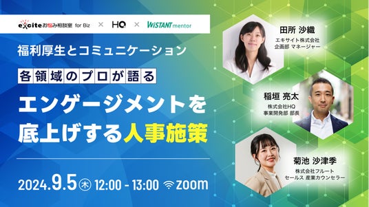 エキサイト株式会社(所在地:東京都港区、代表取締役社長:西條 晋一)は、株式会社HQ、株式会社フルートと3社共同で「福利厚生とコミュニケーション 各領域のプロが語る エンゲージメントを底上げする人事施策」をテーマに9月5日(木)12:00~参加費無料のウェビナーを開催します。