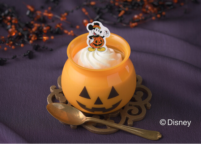 ジャック・オ・ランタンの器に入った、ハロウィン限定プリン。かぼちゃの甘みと濃厚なコクが広がるかぼちゃプリンに、生クリーム入りホイップクリームを絞りました。ミッキーデザインのピック付き!