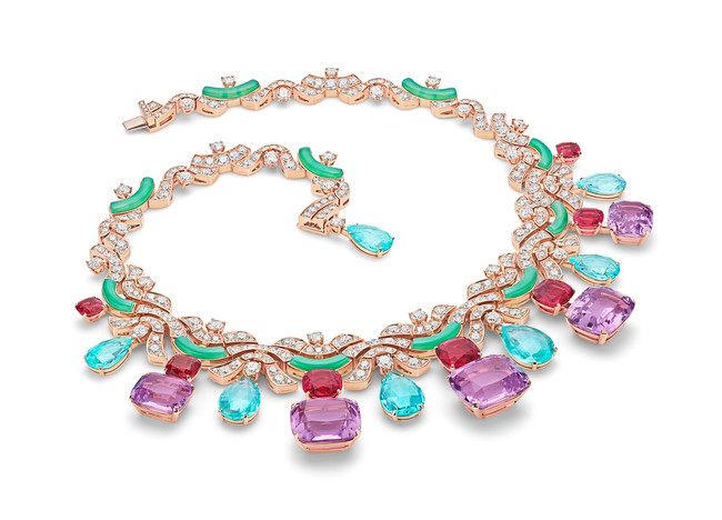 この特別な機会にカーラ・ブルーニは、「カラーファンタジア」と名付けられたネックレスを着用しました。クンツァイトのモダンな色彩が豊かな独自のカラーパレットを特徴とするこのネックレスは、ブルガリの卓越したノウハウと無限の創造性を改めて浮き彫りにしています。「カラーファンタジア」ネックレスは、5つのクッションクンツァイトと、パライバトルマリン、ルベライト、クリソプレーズのユニークなカラーで波のようなウェーブを表現し、鮮やかでモダンなカラーストーンは、ブルガリならではの快活なアプローチを示しています。