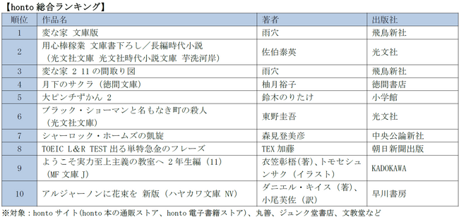 hontoランキングは、honto サイトと、honto サービス実施店の丸善、ジュンク堂書店、文教堂などで購入された書籍や電子書籍の販売データをもとに集計しています。