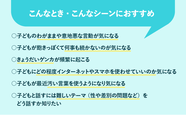 さらに、「子どもがわがまま」「いじめ」「きょうだいゲンカ」「ネットやSNSとの関わり方」「性教育やアダルトコンテンツについて」など、子育てにまつわる問題にどう対処するのがよいかがわからず、「うちの子、このままで大丈夫?」と頭を悩ませている親も多いのではないでしょうか。