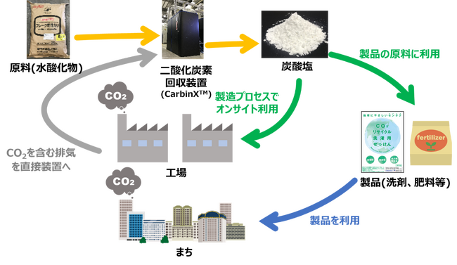 東京ガスでは、都市ガス機器利用時の排気に含まれる二酸化炭素(CO2)と水酸化物を反応させ、様々な用途で利用可能な炭酸塩をお客さま先(オンサイト)で製造する「CO2資源化サービス」を、日本で初めて開始しました。さらに、オフィスビルや商業施設等、炭酸塩のオンサイト利用が難しいお客さまに向けても本サービスを展開していくことを目指し、炭酸塩を原料とした洗剤や肥料を開発しました。都市ガス機器の排気に含まれるCO2を回収・利用した洗剤、肥料の開発は日本初となります。このようなCO2リサイクル製品がCO2を排出した地域(まち、工場等)の中で利活用される「地域におけるカーボンリサイクル」も視野に、今後、お客さまと共に、CO2リサイクル製品の利用モデル構築を目指します。