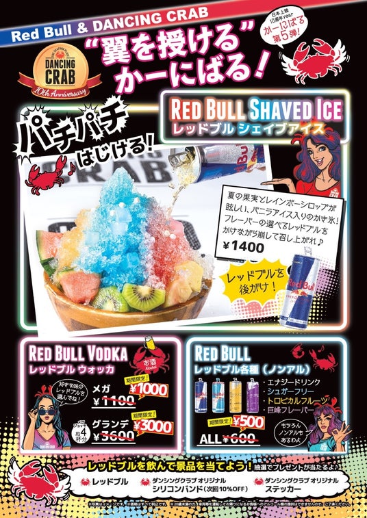 今年10月に日本上陸10周年を迎えるダンシングクラブでは、季節ごとのフェアやキャンペーンを開催し、いつ来てもワクワクするレストラン体験をお届けしています。7月1日(月)からは、エナジードリンク市場で世界的なシェアを誇る「レッドブル」とコラボしたフェアを開催。スイカやキウイ、パイナップルとレインボーシロップが眩しいバニラアイス入りのかき氷「レッドブル シェイブアイス」、4種の「レッドブル」から、お好きな種類を選んで組み合わせるカクテル「レッドブル ウォッカ」は、今だけのお得な価格でダンシングクラブらしい「メガジョッキ」と、パーティーにも最適なメガジョッキ4杯分の「グランデ」の2種類。合わせて「レッドブル」単品も販売いたします。