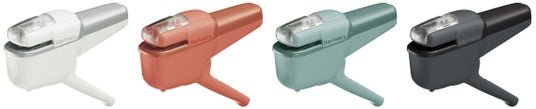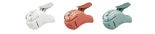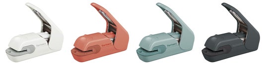 針なしステープラー<ハリナックスプレス>(左から)「ペールホワイト」、「サーモンピンク」、「ブルーグリーン」、「セピアブラック」