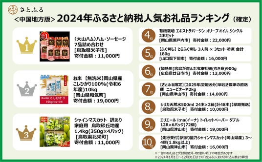 ふるさと納税ポータルサイト「さとふる」を運営する株式会社さとふる(本社:東京都中央区、代表取締役社長 兼 CEO:藤井 宏明)は、「さとふる」における<中国地方版>2024年ふるさと納税人気お礼品ランキング(確定)(※1)を発表します。
