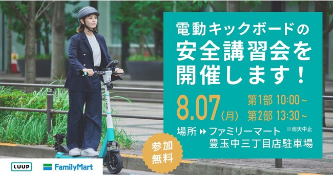 株式会社ファミリーマート(本社:東京都港区、代表取締役社長:細見研介、以下「ファミリーマート」)は株式会社Luup(本社:東京都千代田区、代表取締役社長兼CEO:岡井大輝、以下「Luup」)と電動キックボードの安全運転講習会を実施します。尚、コンビニエンストアが電動キックボードの安全運転講習会を主催するのは初(※)となります。※Luup調べ