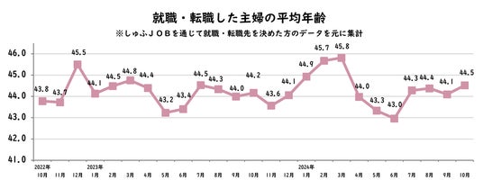 転職しゅふの平均年齢は、前月比+0.4歳、前年同月比+0.3歳の44.5歳。