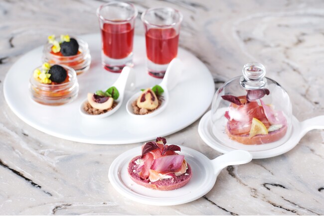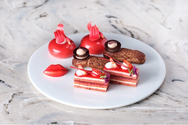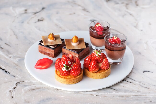 存在感抜群の「いちごのタルト」、マーブル模様が美しい「ビターショコラのムース」、ラズベリーピューレを加えたチョコレートのヴェリーヌなど、豪華なスイーツ7種類に加え、生ハムとレッドアンディーブのオープンサンドや、フォアグラとアマレーナチェリーのムース、牛肉とビーツのダブルコンソメスープなど、高級食材をふんだんに使用した特製セイボリー4種類をご堪能いただけます。
