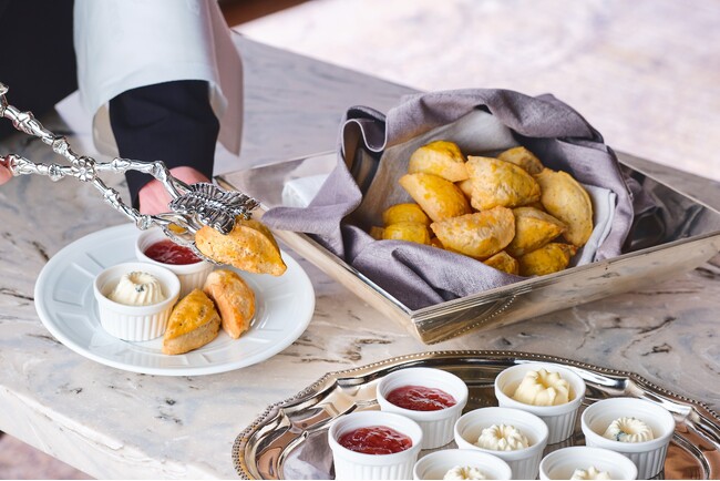 式場内のベーカリーで焼き上げるスコーン2種類は、焼きたてをお席までお届けいたします。コンディメントも定番のクロテッドクリーム、旬のいちごジャム、マスカルポーネ&ゴルゴンゾーラクリームの3種類からお好みでお選びいただけます。外はサクッと、中はしっとりしつつも軽い食感のスコーンとあわせてお召し上がりいただけます。