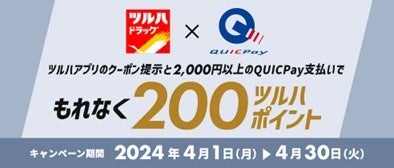 株式会社ジェーシービー(本社:東京都港区、代表取締役兼執行役員社長:二重 孝好、以下:JCB)は、株式会社ツルハ(本社:北海道札幌市、代表取締役社長:八幡 政浩)と、2024年4月1日(月)から4月30日(火)まで、「ツルハでQUICPayを利用すると、200ツルハポイントプレゼントキャンペーン」を実施します。