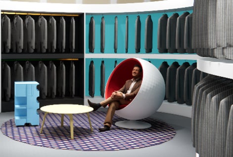 本店舗の新内装は、株式会社インサイドアウトの久保寛人氏監修のもと、従来のショップコンセプトである「LOFT OF LONDON」に、「レトロフューチャー」のエッセンスを加えたデザインにいたしました。店頭ゲートや壁面什器には曲線デザインと、“オリヒカブルー”を基調とした新しいカラースキームを採用。スーツショップの直線的で堅いイメージを払拭し、お客様が入店しやすい空間を演出いたしました。