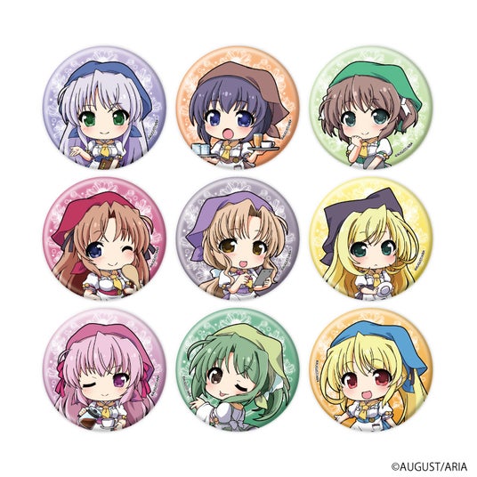 大きさおよそ5.7cmの缶バッジ。ヒロインたちが「トラットリア左門」の制服風カフェ衣装を着たオリジナルミニキャラのお顔部分をクローズアップしており、そのキュートな表情をじっくりと眺めることができます♪