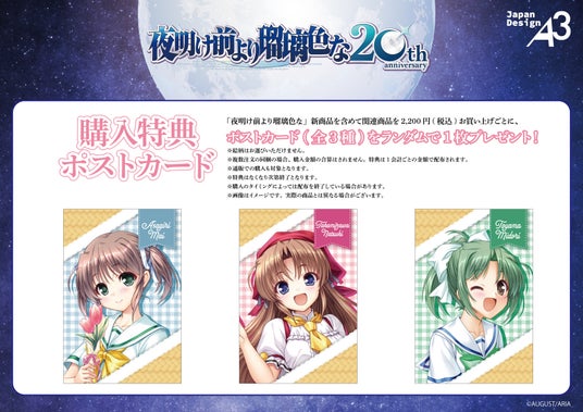 今回発売した『夜明け前より瑠璃色な』の新作グッズを含む関連商品を1会計で2,200円(税込)お買い上げごとに、公式描き下ろしイラストを使用したポストカード(全3種)をランダムで1枚プレゼント♪
