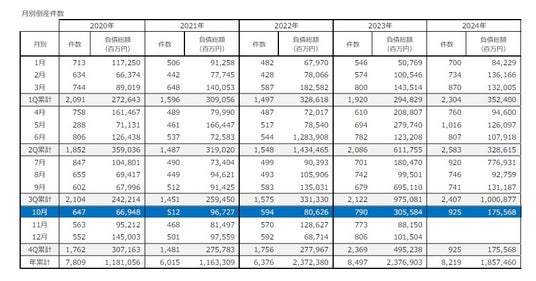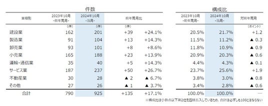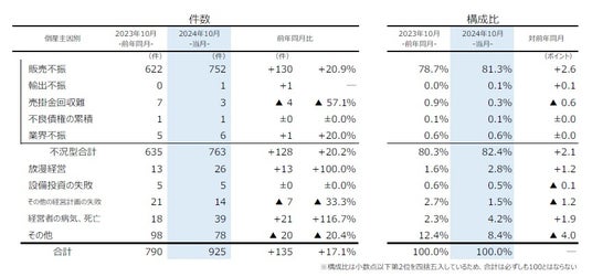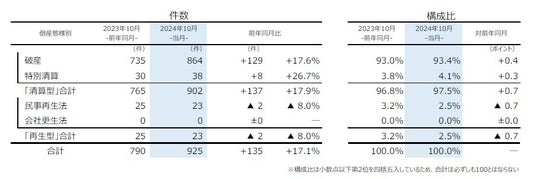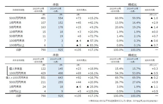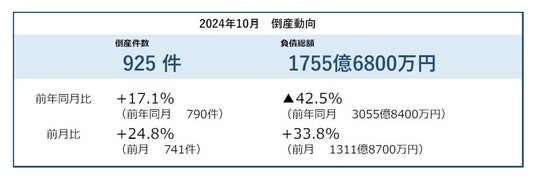 - 倒産件数は925件(前年同月790件、17.1%増)となり、30カ月連続で前年同月を上回った。2024年では5月(1016件)に次いで2番目に多く、10月としては2013年(918件)以来の900件超えとなった