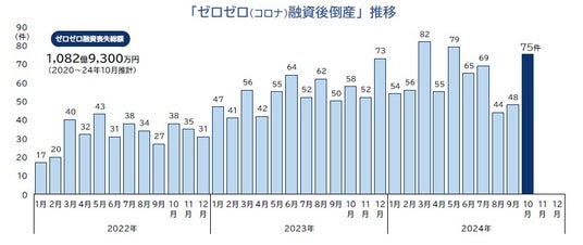 「ゼロゼロ(コロナ)融資後倒産」は、75件(前年同月58件、29.3%増)発生し、前年同月を上回った。2024年1-10月累計は627件となり、前年同期(527件)を100件上回っている。また、「不良債権(焦げ付き)」に相当するコロナ融資喪失総額は推計で約1082億9300万円にのぼり、国民一人あたり約900円の負担が発生している計算になる。