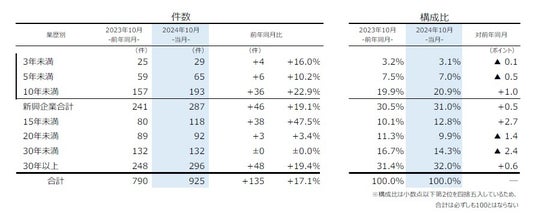 業歴別にみると、「30年以上」が296件(前年同月248件、19.4%増)で最も多く、全体の32.0%を占めた。このうち、老舗企業(業歴100年以上)の倒産は16件(同11件、45.5%増)発生した。