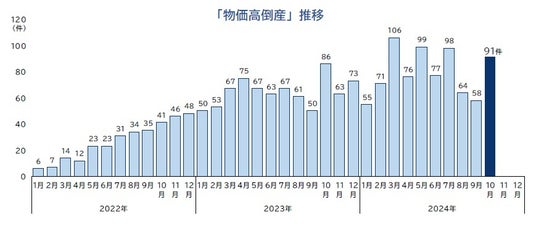 「物価高倒産」は、91件(前年同月86件、5.8%増)発生し、2022年3月以降32カ月連続で前年同月を上回った。2024年1-10月累計は795件と、2023年通年(775件)をすでに上回り、過去最多を更新した。また、十分な価格転嫁ができず経営破綻に至った「値上げ難型」の倒産は15件発生した。