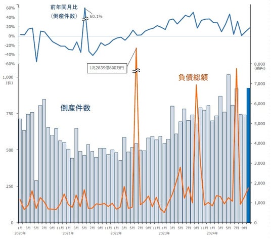 株式会社帝国データバンクは、2024年10月の企業倒産件数(負債1000万円以上の法的整理が対象)について集計し、分析を行った。