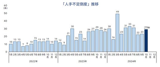 「人手不足倒産」は、29件(前年同月29件)発生し、前年同月から横ばいとなった。2024年1-10月累計は287件と、2023年通年(260件)をすでに上回り、過去最多を更新している。従業員や経営幹部などの退職・離職が直接・間接的に起因した「従業員退職型」の倒産が8件発生し、2カ月連続で前年同月を上回った。