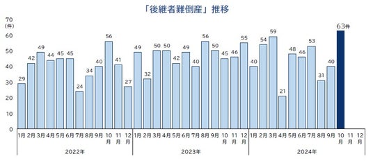 「後継者難倒産」は、63件(前年同月45件、40.0%増)発生し、過去最多を更新した。2024年1-10月累計は455件と、過去最多だった前年同期(463件)に迫る件数となった。業種別にみると、『建設業』(23件)が最も多く、『製造業』(11件)、『サービス業』(11件)が続いた。負債1億円未満の小規模倒産が47件で7割を占めた。