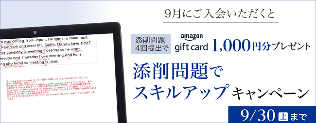 Asteria for Businessの「添削問題でスキルアップキャンペーン」では、入会後、10月末までに添削問題4題に取り組み提出、完了報告をするとAmazonギフトカード1,000円分をプレゼントします。