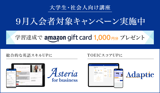 オンライン英会話つき総合講座「Asteria for Business」とTOEIC(R)対策講座「Adaptie」の両講座で、9月から英語学習を効果的にスタートできるキャンペーンを実施中です。