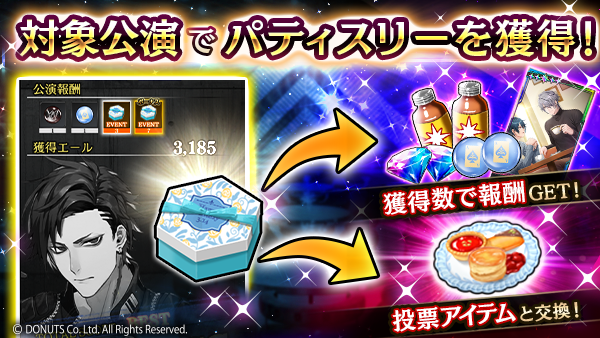 投票アイテム「スイートアソート」をキャストに贈ることで、キャストは投票ptを獲得でき、ポイントが大きい方が順位が高くなります。