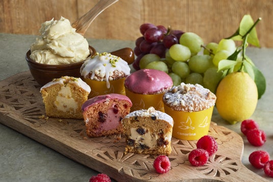 果実とバターをテーマに、様々なフルーツバターの世界観をケーキマフィンで表現しました。丁寧に焦がしたバターと生クリーム・焦がしはちみつ・バニラを使用した、バターの風味豊かな奥行きのある味わいの生地に中央に忍ばせた果実とバターのクリームで、果実感を感じるマフィンに仕上がりました。