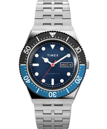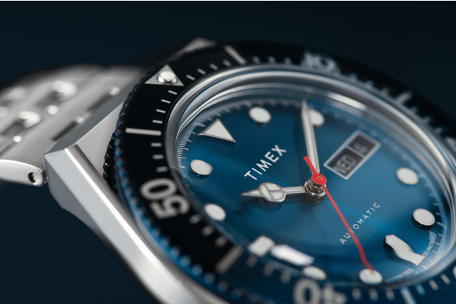 モデル名にMechanicalのMを関した「M79」はアプライドインデックスや針など本格的なディテールを備えているのが特徴。ムーブメントには信頼性が高く堅牢なMIYOTA製の21石自動巻きムーブメント(パワーリザーブ約40時間)を採用し、ケースバックもテンプの動きが見えるシースルー仕様となっています。今シーズンの新色であるブラックとオーシャンブルーのツートーン・ベゼルに合わせたメタリックブルーの文字盤は本シリーズ初の仕上げで、コーディネートに爽やかさをプラスしてくれます。サイズは『Q TIMEX』シリーズより2mm拡大した40mm径で、厚みは14.5mmと腕に着用しやすく、袖口への干渉も少ないバランスを実現。ふっくらしたドーム型アクリル風防はこのモデルでも健在で、機能面ではデイ・デイト表示、50m防水を保持しています。さらに、SSブレスは本モデルから従来のメッシュタイプではなく、コマタイプの新型ブレスレットに変更されたことでカジュアルでもビジネスシーンでも活躍します。